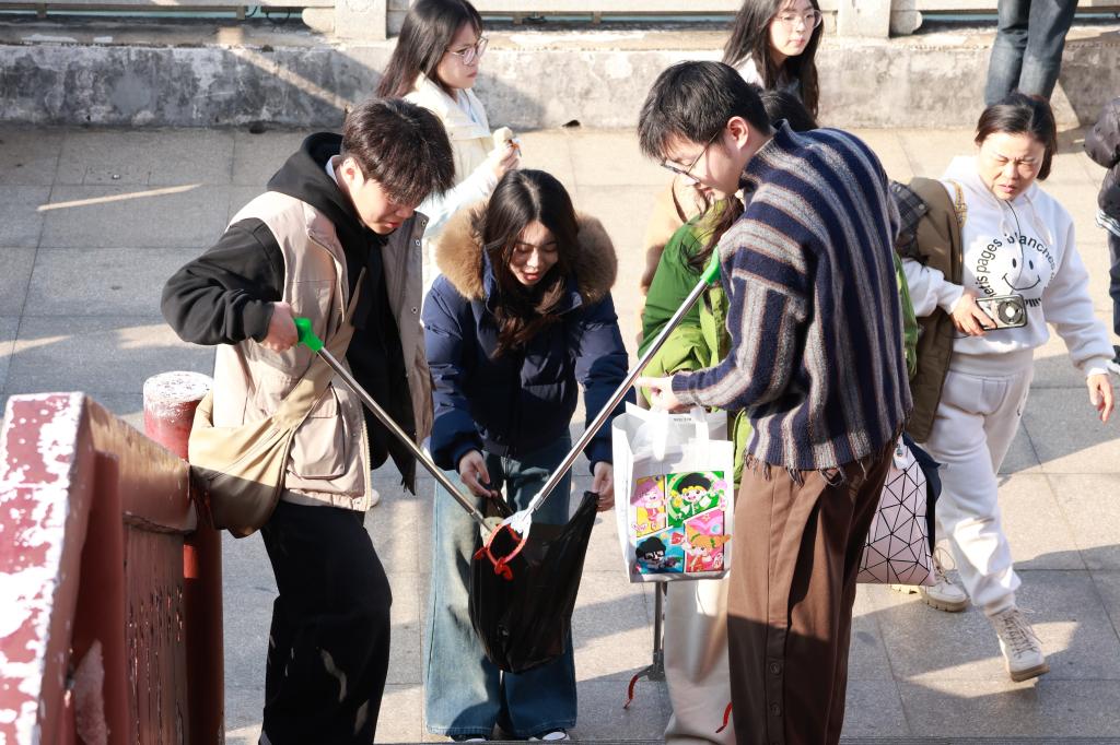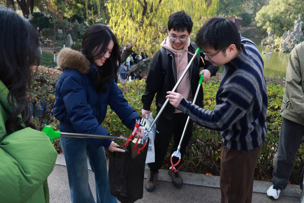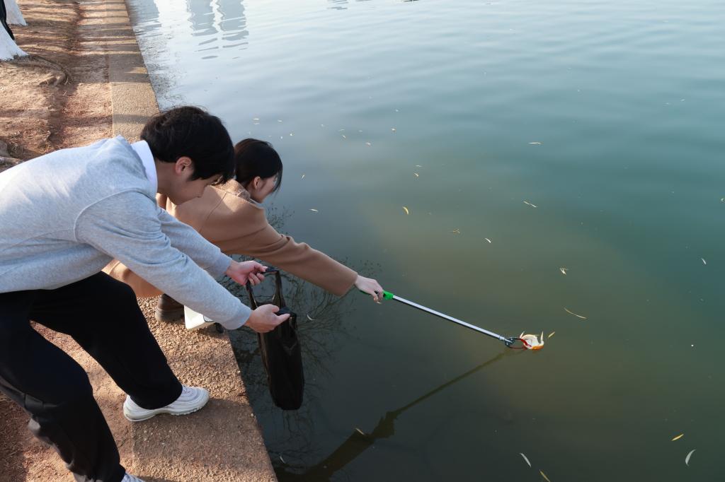 参观学习结束后,同学们环绕年嘉湖开展“湖清岸绿”环境清理志愿服务。以小组为单位,学生干部分工协作,手持垃圾袋和清洁工具沿湖畔步道与绿化区域细致捡拾被丢弃的塑料瓶、纸屑、烟蒂等杂物,并对收集到的垃圾进行初步分类整理。经过一个多小时的清理,湖区周边环境得到初步改善。